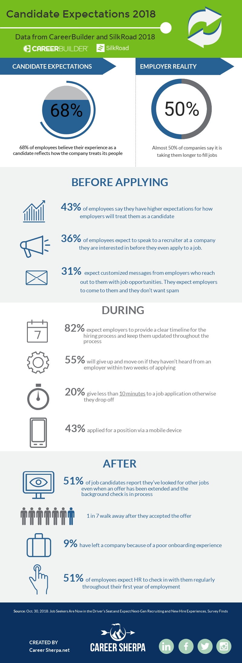 CareerBuilder and SilkRoad teamed up to survey 1,114 full-time employees and 1,138 employers about the candidate recruitment process. The summary of findings is in this October 30, 2018 press release. Summarized below are some of the key findings from their research and an infographic to share.