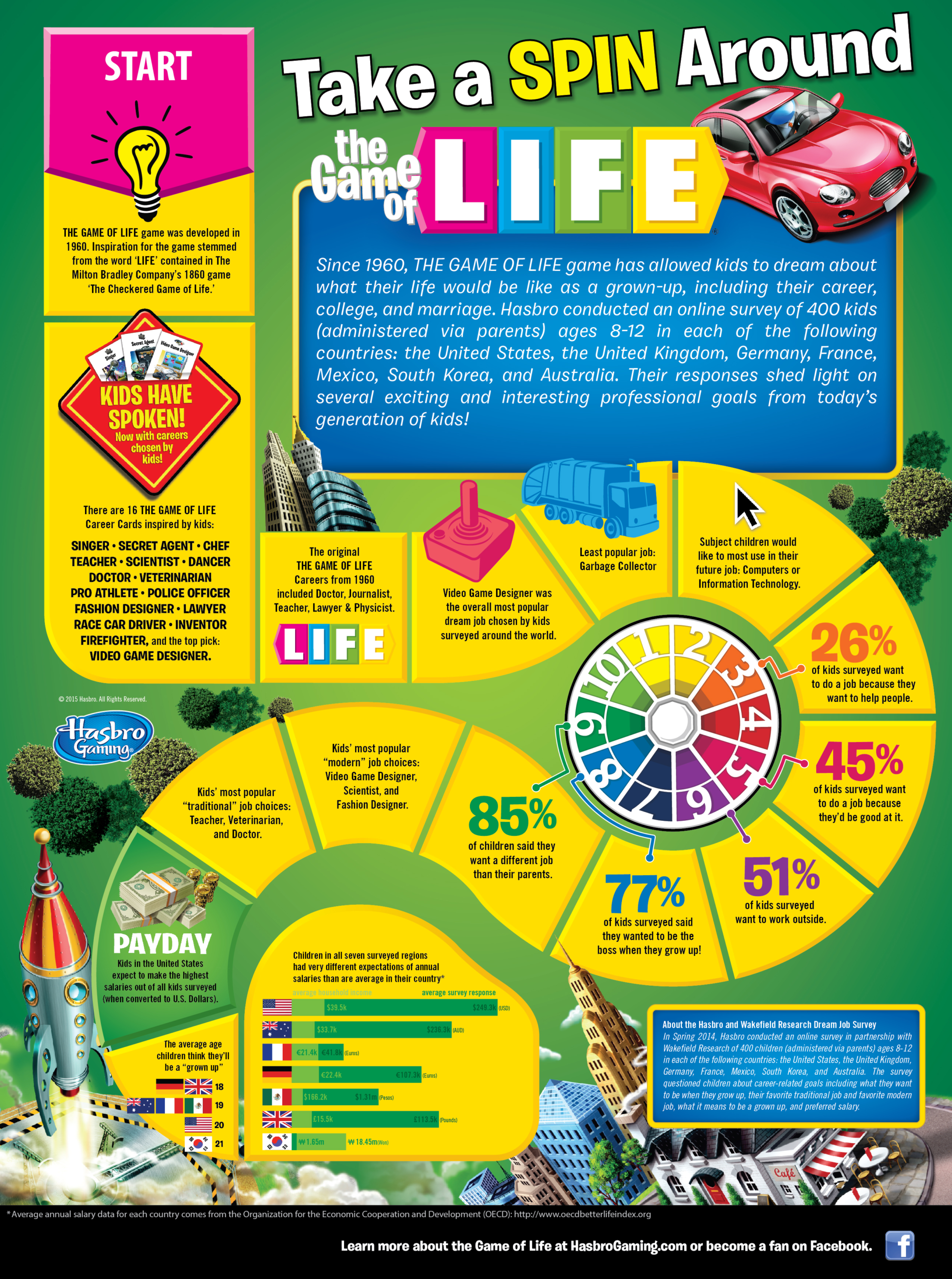 In the Spring of 2014, Hasbro surveyed 400 8-12 year old kids (administered via parents) from the United States, the United Kingdom, Germany, France, Mexico, South Korea, and Australia. The children were asked what they want to be when they grow up, their favorite traditional job and favorite modern job, what it means to be a grown up, and preferred salary.